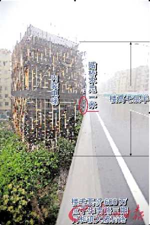 自建房距離華南路三期不足1米,房子和華南路仿佛在跳“貼面舞”。更讓人驚奇的是,該自建房不但每層都有6套大小不一的套房,而且還安裝了電梯。工地負責人說,如果全部賣出,這棟房子的身價高達600多萬元。