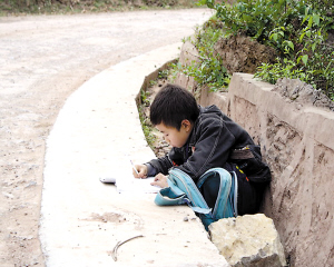 “他不被路過(guò)的汽車、行人而影響,以溝為凳子,公路路沿為桌子,認(rèn)真地寫著作業(yè)!弊蛱,記者找到了網(wǎng)友“情緣”發(fā)布的《公路邊寫作業(yè)的娃》。因?yàn)橐延谐^(guò)1400次的點(diǎn)擊和50余人次的回復(fù),該帖子已被版主“置頂”。帖子中貼出了6張圖片:一段崎嶇彎道旁,一名身材矮小的小男孩正蹲在公路排水邊溝中,佝僂著身體,做作業(yè)。旁邊還有一個(gè)藍(lán)色書(shū)包和課本。