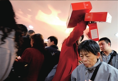 昨天上午9點,在東城區(qū)王府井工美大廈奧運特許商品旗艦店門外,上百名市民在門口排起長隊準備搶購,隊伍最長排出數(shù)十米。上午9點30分,工美正式開始營業(yè),門口排隊的市民一下涌進商場,十余名工作人員在一旁維持秩序。