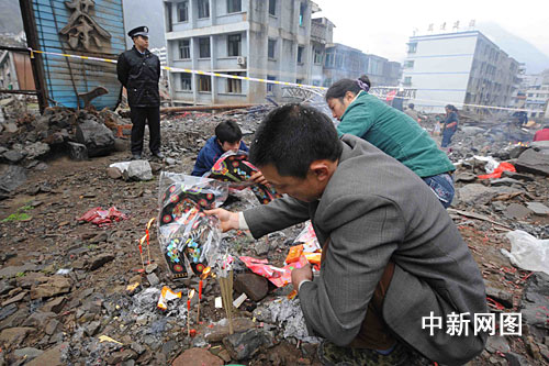 這是大地震后第一個(gè)傳統(tǒng)清明節(jié),老縣城廢墟外的封閉鐵絲網(wǎng)清晨七時(shí)準(zhǔn)默默打開(kāi),特意為此地幸存的父老鄉(xiāng)親們開(kāi)放。綿綿人流回到已成廢墟的千家萬(wàn)戶(hù)和學(xué)校機(jī)關(guān)等地前,焚香燃燭,捧上鮮花。只聽(tīng)遍地哭聲四起,人人都向遇難親人傾吐衷腸。