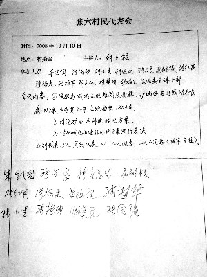 一份村民代表會(huì)議記錄上的簽名,代表說是簽到證明,鎮(zhèn)領(lǐng)導(dǎo)說是表決簽名