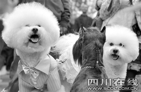 “當(dāng)時在網(wǎng)上比熊俱樂部上面認(rèn)識的。”據(jù)新郎幺幺的主人馮悅悅介紹,一般喜歡養(yǎng)狗的人都會有一個交流群,平時大家有什么經(jīng)驗或者需要配種之類就可以網(wǎng)上聯(lián)系。3月下旬,群里舉辦了活動,要選最美的狗狗配對拍婚紗照!扮坨酆涂煽梢粋髡掌屯瑫r被選上了!瘪T悅悅說,剛巧新娘可可的主人于瀾瀾也正想給2歲的可可找個伴兒,大家一拍即合,舉行了這場婚禮。