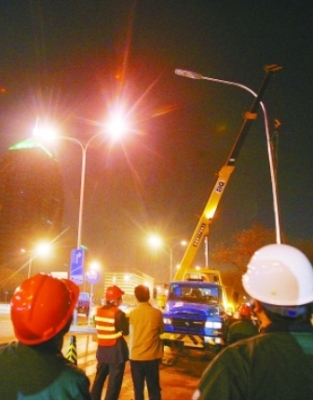 昨晚11時(shí)40分,北京長(zhǎng)安街東單北大街至建國(guó)門(mén)路段上,嶄新的13米單弧鐵桿路燈拔地而起,宣告長(zhǎng)安街路燈改造工程全面啟動(dòng)。