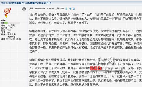 “現(xiàn)在婚姻都得先考慮對方有沒有房和車”,近日,網(wǎng)友“aijiay”在紅網(wǎng)論壇貼出一篇題為《26歲的我離婚了!80后婚姻注定死在房子上》的帖,帖中稱83年出生的她兩年前與82年出生的老公在北京租房完婚,后因“身邊的同事有車有房”而萌生買房念頭,最后卻因手頭拮據(jù)多次發(fā)生爭吵后離婚。此帖短短幾日引來網(wǎng)友陣陣熱議,支持有贊賞同在,也有人無奈感嘆。