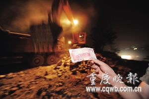 昨日傍晚,沙坪壩區(qū)雙碑光榮坡一拆遷工地上,挖掘機(jī)挖出一堆錢。正在現(xiàn)場(chǎng)的拾荒者和附近群眾,一擁而上爭(zhēng)搶這些錢財(cái)。當(dāng)晚,該房原主人蔡先生獲知消息后趕到現(xiàn)場(chǎng),只撿到幾片被撕碎的人民幣碎片。蔡表示,自己遺忘在房?jī)?nèi)的錢至少有四五萬(wàn)元。