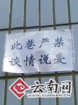 “此巷嚴禁談情說愛”,繼南京現(xiàn)“最牛公開信” 勸大學(xué)生情侶莫開房后,昨日,昆明學(xué)院昆師路校區(qū)內(nèi)的一條小巷里也出現(xiàn)了一張類似告示。
