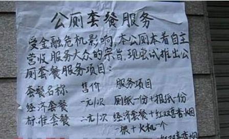 據(jù)悉,告示上將該項(xiàng)服務(wù)分為五個(gè)等級,分別是經(jīng)濟(jì)套餐、標(biāo)準(zhǔn)套餐、商務(wù)套餐、豪華套餐、總統(tǒng)套餐。每個(gè)套餐還列出了各自的服務(wù)項(xiàng)目。例如經(jīng)濟(jì)套餐就贈送廁紙一份、報(bào)紙一份,收費(fèi)也相當(dāng)?shù)土瑑H僅需要一元;2元的標(biāo)準(zhǔn)套餐則在經(jīng)濟(jì)套餐的基礎(chǔ)上送出紅雙喜香煙一根火機(jī)一個(gè)。最雷人的應(yīng)該算是價(jià)值10元的豪華套餐,竟然有專業(yè)陪聊的服務(wù)項(xiàng)目。而20元的總統(tǒng)套餐也讓人摸不著頭腦,居然包括彩票一張和精美紀(jì)念冊。這些都讓網(wǎng)友們好奇不已:不知道當(dāng)你如廁的時(shí)候,有人在一旁陪你談心,會是什么樣的感受?而精美紀(jì)念冊的內(nèi)容,又會是什么?