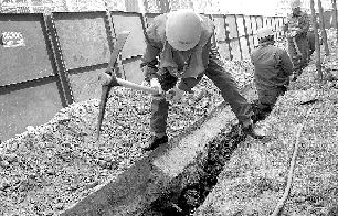 昨日上午,冉屯路清城美苑小區(qū),自來(lái)水公司正對(duì)該小區(qū)庭院管網(wǎng)重新鋪設(shè)管道,原因是該小區(qū)目前使用的管網(wǎng)由開(kāi)發(fā)商出資鋪設(shè),且沒(méi)有經(jīng)過(guò)驗(yàn)收,入住2年爆管50多次,報(bào)修100多次,鋪設(shè)的PE管材屬于被禁用產(chǎn)品。