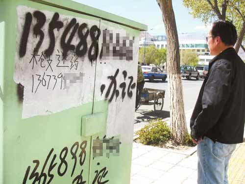 住在娘熱路附近的卓女士告訴,一些涂寫非法小廣告的人都是趁天黑或早上人比較少的時候伺機作案。他們這些人就是和管理部門‘打游擊’,很難被抓住!弊颗扛嬖V記者,拉薩是自治區(qū)的首府城市,而娘熱路是我市的一條主要干道,違法分子到處亂涂亂寫非法廣告嚴重影響了市容市貌,出售“槍支迷藥”的非法小廣告出現(xiàn)在城市中心地帶更會讓內(nèi)地游客擔心拉薩的社會治安,從而給拉薩的經(jīng)濟社會發(fā)展帶來不小危害,希望有關部門進一步加大工作力度,狠狠打擊這些違法分子。