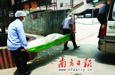 中午1時許,在保安與警察的護送下,女子尸體裹著白布被抬出,隨后被殯葬車接走。阿保和房東則被警方帶走調查。