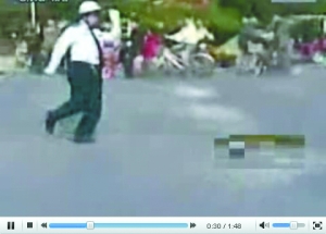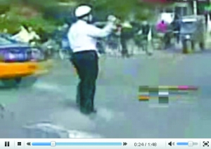 視頻于3天前出現(xiàn)在優(yōu)酷網(wǎng)上。打開視頻,戴白頭盔、穿藍(lán)制服的男子在繁忙的路口指揮交通。