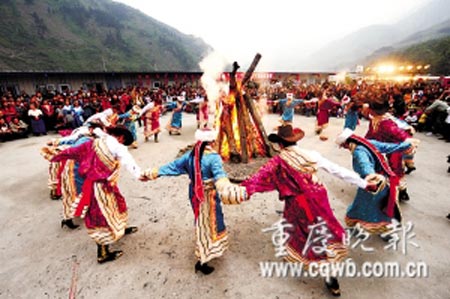 戰(zhàn)勝了地震、恢復(fù)了重建,昨天,四川省汶川縣映秀鎮(zhèn),人們點燃篝火,跳起“鍋莊”,迎接“五一”。