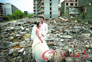 2009年4月21日下午,在(四川綿竹縣)漢旺鎮(zhèn)舊城東汽中學(xué)的殘?jiān)珨啾谏铣霈F(xiàn)美麗感人的一幕:曾救出“可樂男孩”薛梟的志愿英雄陳巖與穿著潔白婚紗的妻子彭露在這里拍下婚紗照,以紀(jì)念他們動(dòng)人愛情的永恒紀(jì)念。
