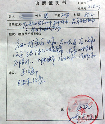 在醫(yī)院出具的張先生的診斷證明上,有這樣的記錄:“左額頭皮下血腫,左耳頓挫傷,多發(fā)軟組織損傷,左第11肋骨折不除外”。