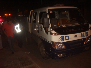 陳警官表示,丘海一橫路屬于秀英區(qū),交警馬上聯(lián)系秀英區(qū)城管大隊(duì)的有關(guān)負(fù)責(zé)人,要求協(xié)助調(diào)查。秀英區(qū)城管大隊(duì)積極配合,該大隊(duì)教導(dǎo)員王善要求隊(duì)里未上牌且當(dāng)晚出來(lái)執(zhí)行任務(wù)的執(zhí)法車(chē)輛迅速趕往現(xiàn)場(chǎng)。不到10分鐘的時(shí)間,現(xiàn)場(chǎng)就開(kāi)來(lái)一輛城管執(zhí)法車(chē)輛。經(jīng)目擊市民黃先生仔細(xì)辨認(rèn),確定該車(chē)并不是肇事逃逸車(chē)輛!斑@輛車(chē)雖然沒(méi)有上牌,但是車(chē)廂兩側(cè)是用鐵皮包住的,而肇事逃逸車(chē)輛的車(chē)廂兩側(cè)上層只有鋼管,而且肇事逃逸車(chē)輛也沒(méi)這么新!秉S先生說(shuō)。