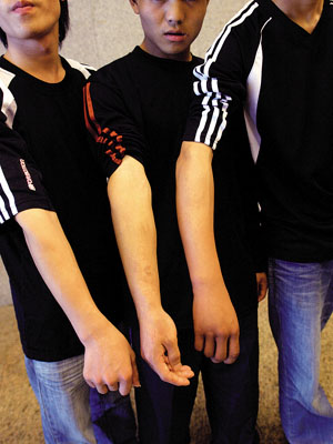 前天,小羌他們?nèi)死鹨滦,向記者展示了右手前?見(jiàn)左圖)。從表面上看,手臂上沒(méi)有傷口,但就感覺(jué)比他們的左手要腫,而且有些不協(xié)調(diào)的彎曲。小鵬和小田說(shuō),他們的手臂至今還在疼痛。