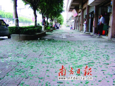 昨日,記者再次來到事發(fā)地看到,警方仍未解除警戒線,幾名民警在現(xiàn)場緊張勘察。事發(fā)街道兩旁的玻璃碎片仍是灑落一地,離爆炸核心位置20多米遠(yuǎn)的一家修理店老板介紹,很多玻璃碎片都是從對面街道飛過來的,他指著一塊插入卷閘門的石頭說:“這個(gè)也是從對面飛過來的,當(dāng)時(shí)爆炸的威力太可怕了!