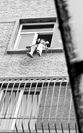 “你真傻啊,有啥想不開的,非要抱著自己的孩子尋短見?”樓下,人群中一名中年婦女不停地勸著!皠e管我,他不回來(lái),我也不活了!迸忧榫w很激動(dòng),左手抱著孩子,右手扶著窗戶,邊哭邊說(shuō),并時(shí)不時(shí)騰出手比畫一番。懷里的孩子一直朝外看著,也不時(shí)地扭動(dòng)身子,讓樓下的人群為倆人的安全捏一把汗。