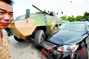 昨天下午2時30分,在107國道新塘路口經典酒店門口處,一輛輪式裝甲車與一輛價值百萬元的凌志轎車相撞。車禍造成該路段的擁堵。同時,另外一輛轎車和一輛大貨車行經此處因避讓不及也撞上了。