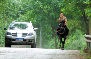 一車(chē)一馬在彎曲的公路上奔跑起來(lái),汽車(chē)?yán)锍瘫盹@示時(shí)速為50多公里,“大黑”卻反而領(lǐng)先。