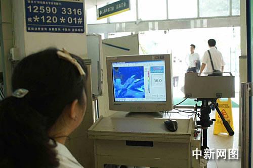 中新網(wǎng)重慶5月12日電 (曾理 杜遠(yuǎn))在成都確診中國(guó)內(nèi)地首例甲型H1N1流感患者的當(dāng)天,三軍醫(yī)大重慶新橋醫(yī)院在門(mén)診大廳門(mén)口增設(shè)紅外熱線(xiàn)測(cè)溫儀,篩查赴該院就診人群中的高溫患者。