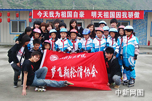 中新網(wǎng)武漢5月12日電 (楊宏斌 劉英)湖北經(jīng)濟(jì)學(xué)院輪滑協(xié)會(huì)13名成員自費(fèi)赴四川汶川地區(qū),給汶川縣映秀小學(xué)、水磨小學(xué)的孩子們帶去了24雙輪滑鞋子和護(hù)具,并對(duì)他們進(jìn)行培訓(xùn),希望通過輪滑運(yùn)動(dòng),見證跌倒之后爬起來的勇敢人生。