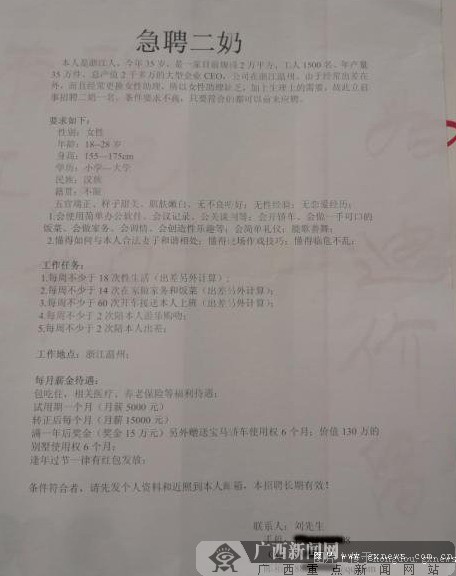 記者在網(wǎng)上找到了這張啟事的圖片,上面介紹說,招聘二奶的主角是浙江溫州一家服裝公司的CEO,姓劉,招聘的目的是為了滿足“工作出差、生活上的需要!