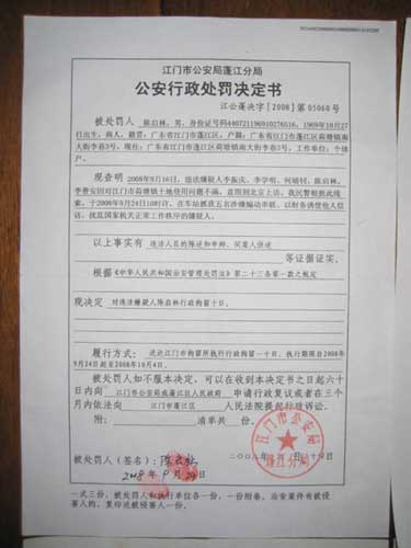 但是,對(duì)于江門日?qǐng)?bào)刊登的報(bào)道,一名網(wǎng)友給本網(wǎng)提供了《行政處罰決定書》的圖片,在該圖片上可以清楚地看到,決定書上寫著“現(xiàn)查明2008年9月16日,違法嫌疑人……因?qū)T市荷塘鎮(zhèn)土地使用問題不滿,意圖到北京上訪。我民警根據(jù)此線索,于2008年9月24日10時(shí)許,在車站抓獲五名涉嫌煽動(dòng)串聯(lián)、以財(cái)務(wù)誘使他人信訪,擾亂國(guó)家機(jī)關(guān)正常工作秩序的嫌疑人”,在決定書下方有被處罰人簽名和指模,以及江門市公安局蓬江分局蓋印。該名網(wǎng)友同時(shí)提出質(zhì)疑,聲明摘錄如下: