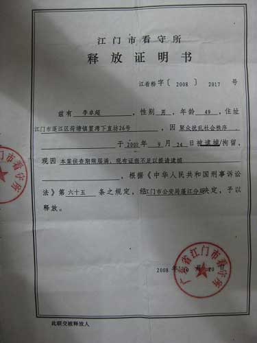 事實(shí)上,蓬江區(qū)公安分局2008年9月24日就以“擾亂社會(huì)管理秩序”為名對(duì)7人進(jìn)行了行政拘留,相應(yīng)的行政處罰決定書稱:“我民警于2008年9月24日10時(shí)許,在車站抓獲五名涉嫌煽動(dòng)串聯(lián)、以財(cái)物誘使他人信訪,擾亂國(guó)家機(jī)關(guān)正常工作秩序的嫌疑人。”