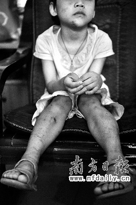 “身上還疼”,心怡見到記者時說。昨日下午,記者在廣州市花都區(qū)政府附近某幼兒園見到了她。其臉上有7處長短不一的傷痕,腦門上的一處還出血,下巴處硬幣大小的瘀傷分外明顯,“這是媽媽拉我,我倒在地上時摔的”。她的兩條胳膊同樣是傷痕累累,右手腕腫脹變形,腿和腳上傷痕密集,右腿上一處約2厘米長的傷痕已經淤血化膿。當幼兒園老師掀起心怡的衣服時,其背部、臀部成片的紅色條狀傷痕顯露出現(xiàn)。有的傷痕明顯是不同時間毆打,舊傷未愈又添新痕。記者粗略計算,外傷不止70處。
