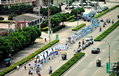 昨天下午1時20分左右,海豐縣城華夏花園住宅小區(qū)里走出一隊陣容龐大的送殯隊伍,先是數(shù)十輛摩托車魚貫而出,上了馬路后一字排開將一邊路面堵住,不讓車輛通過,為送殯隊伍讓出了一條道來;接著是敲鑼打鼓、抬花圈、扛挽幛的人,孝子孝孫披麻戴孝抬著靈柩,后面是一大批送殯的親戚朋友,一律打著太陽傘、佩戴黑袖圈;緊隨其后的是7輛豪華小車,多是奔馳、奧迪等名牌車。送殯隊伍排出了約1公里的長龍,從海豐縣二環(huán)路徒步走到海城美食街,再轉至紅城大道,摩托車隊一路“維持秩序”,確保送殯隊伍暢行無阻。直到海豐縣海城鎮(zhèn)政府附近,喪主親屬坐上中巴,將靈柩送往火葬場火化,整個送殯過程持續(xù)約40多分鐘。