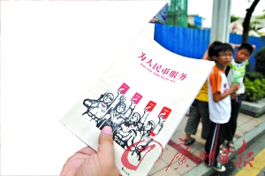 “六一”節(jié)即將來臨,在順德大良東區(qū)居住的梁女士,準備為自己讀三年級的兒子買一套全新的文具,翻開兒子的書包,卻意外發(fā)現(xiàn)里面有幾本“歪語錄”筆記本,上面大大個字寫著“為人民幣服務”、“提高警惕,保衛(wèi)老婆”(見上圖)。
