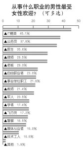 如今,從事什么職業(yè)的男性最受女性歡迎?調(diào)查中選出的十大職業(yè)為:IT精英(45.1%)、公務員(37.9%)、醫(yī)生(35.6%)、律師(29.5%)、老板(29.3%)、自由職業(yè)者(23%)、事業(yè)單位職工(21.9%)、教師(21.4%)、軍人(20.5%)、學者(17.4%)。