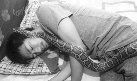 年輕人飼養(yǎng)另類動(dòng)物已不足為怪,但住在武昌梨園附近26歲的趙晶養(yǎng)了緬甸蟒、平原巨蜥、蝎子等多種動(dòng)物,他工資的大部分都用來飼養(yǎng)動(dòng)物了。更讓人驚訝的是,他常年與蟒蛇同床共眠。