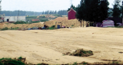 霞坡大村一康姓村民說,早在2006年原村民小組長在任時(shí),曾有外地人提出在該村邊采礦,遭到村民的反對,只采了幾天就停工了。去年,新一屆村干部上任后,有的村干部同意將地租給他人采礦。從今年3月底開始,一些不法人員進(jìn)入該村離大海約1.5公里處的村邊林地,砍毀了大片茂盛的速生林,架起采礦機(jī)械,搭起簡易工棚,大肆抽取沙土里面含有鈦等金屬的黑、黃色礦砂。自此以后,原先保護(hù)良好的生態(tài)環(huán)境遭受到了嚴(yán)重破壞,大片的沙灘地被挖塌了,村邊林地被挖成大深潭,對孩子們的安全構(gòu)成了很大的威脅。