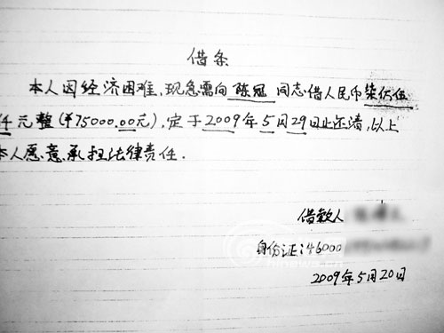 一會,小鋒看到阿東將他的朋友阿冠從另一個(gè)包廂里請進(jìn)來!靶⌒值埽铱梢越杞o你3.5萬元,但10天后你要還給我7.5萬!卑⒐谂牧伺男′h的肩膀,小鋒左右為難,想拒絕,但是又害怕對方不讓自己離開。 “好,我同意!眲e無選擇的小鋒咬了咬牙,他按照對方所念的話寫下了借條。為取信于小鋒,阿冠還當(dāng)面將3.5萬元付給阿東。