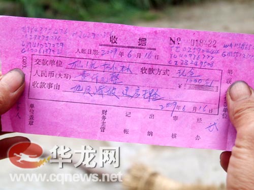 聞聽記者在當(dāng)?shù)夭稍L,村民楊仁林的妻子將隨身攜帶的押金收據(jù)拿出來展示,楊仁林家編號為0018422號的白條“收據(jù)”上顯示,其收款事由為“‘地質(zhì)滑坡建房押金’壹仟元整”,交款時(shí)間為2009年6月16日,經(jīng)辦人:“武”。收據(jù)左右角上注明了其交款面額的編號。