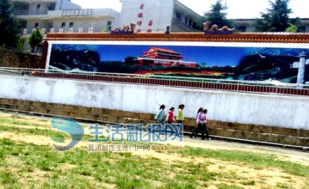 6月16日14時許,記者來到離曲靖市區(qū)約10公里的寥廓街道中學(xué)。足球場旁,一堵長約400多米,高約2米的圍墻異常醒目,面對教學(xué)樓的那一段圍墻,卻突然高出了一截。墻頭鑲嵌有黃色琉璃瓦,上面屹立著有藍黃琉璃瓦做成的兩龍戲珠,而墻壁中間則是一幅北京天安門城樓油畫。
