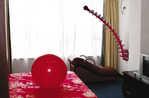 五十多平方米的房間內(nèi),燈光溫馨曖昧,一張大紅床格外引人注目,情趣用品一應(yīng)俱全。記者看到,跟一般的酒店里陳設(shè)不同的是,房間里有很多奇形怪狀的家具。據(jù)周某介紹,除了床是電動床以外,還有歡樂椅、情趣球、S形沙發(fā)等!斑@些可不是體操運動器材,而是情趣酒店的特別設(shè)施,專門供夫妻情侶性生活用的!