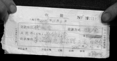 代向記者展示了這個“最牛收據(jù)”,收據(jù)的時間為2005年11月6日,收款人名為鄭和生,收款事由一項竟明確寫著:“菜家溝危巖治理工資好處費”。代某介紹,鄭和生當時為12組組長。收款時,鄭稱,自己為村民拿到征地補償,需要請客吃飯,耽誤時間,所以在他們的征地補償中扣除了300元,并寫下了收據(jù)。事后,代某又多次找到鄉(xiāng)政府、村委會,要求提供扣除補償款的收據(jù),均遭到拒絕。