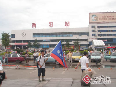 當天一大早,楊世和、楊澤勇父子就起了床,整裝扛上宣傳旗專程到了衡陽火車站,他們一邊照相留念,還不忘使命:宣傳云南,宣傳臨滄和云縣。據(jù)楊世和介紹,他們一路上吸引了不少地方媒體的關(guān)注報道,特別是進入湖南郴州,當?shù)氐某恢蓦娨暸_派出了好多記者圍追堵截采訪父子二人。這一路上父子倆心情都很好,不僅能瀏覽到各地風景,還能完成家鄉(xiāng)父老的重托。但最讓父親楊世和心痛的是,一路上的酷熱天氣,特別是進入湖南以來的太陽很烤人,兒子楊澤勇出現(xiàn)了中暑癥狀,他自己也感覺不舒服。這是他們一路上遇到過的最大困難。