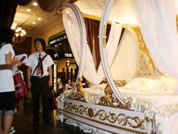 走進(jìn)五號(hào)館展場(chǎng),幾乎所有人的目光都會(huì)立即被成都本土企業(yè)制造的一張價(jià)值五十萬(wàn)元人民幣的豪華大床所吸引。據(jù)制造商介紹,這張價(jià)值五十萬(wàn)元人民幣的豪華大床是用橄欖木材耗時(shí)六個(gè)月純手工雕刻而成,“這張床的設(shè)計(jì)理念取意于西班牙古代皇室風(fēng)格。除做工精美外,整張床還鑲嵌了純金箔和二十六顆施華洛世奇水晶,目前單張床的市場(chǎng)售價(jià)在五十萬(wàn)元人民幣以上!