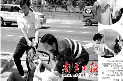 隨后,南方都市報攝影記者陳奕啟與管理員吵起來,推搡中管理員撕裂記者的衣服,并再出招“鎖喉功”。一名市場管理員一拳打中陳奕啟頭部,推搡中陳奕啟被推下人行道,然后又被按倒輪番連踢帶踹,其中一人雙手鎖住記者喉嚨,一人強行搶走攝影包。