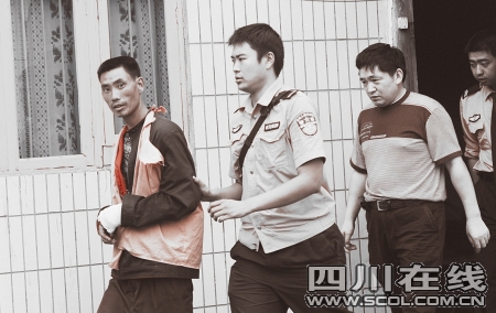 昨日中午12時(shí),劉啟寬穿著彭州市看守所的衣服,戴著手銬,左手包扎著紗布,被警方帶回事發(fā)現(xiàn)場。他個(gè)子高高的,又瘦又黑,沒有穿鞋,始終低頭不語。就在劉啟寬指認(rèn)現(xiàn)場的時(shí)候,其哥哥劉啟保也回來了。兩兄弟對(duì)望一眼后,都匆匆把視線移向別處。