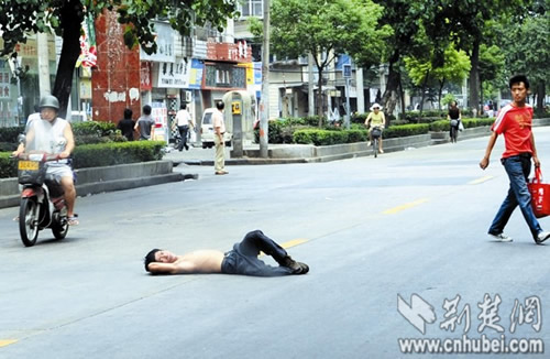 事發(fā)昨日正午,記者在漢陽郭茨口看到,一名男子上身裸露,手提一袋醫(yī)院的病歷資料,情緒激動(dòng)地躺在馬路中央,脊背被路面燙得通紅。此時(shí)路面車流不息,該男子處境十分危險(xiǎn)!翱彀阉貋!”幾名路人見狀后,靠近該男子,欲將其拉到路邊,但該男子并不領(lǐng)情,堅(jiān)決不起身。幾分鐘后,二橋派出所的民警趕來,要求該男子去派出所再說,該男子置之不理。民警表示,早8時(shí)許和10時(shí)許,該男子曾在附近路面躺過兩次,都被他們帶回了派出所,他們這已是第三次為該男子出警!坝惺裁次驼f出來,那樣心里痛快點(diǎn)!币娒窬譄o策,熱心路人們開始輪番上前勸解。眾路人汗流浹背,頂著烈日站在馬路中央,對(duì)該男子動(dòng)之以情、曉之以理。半小時(shí)后,該男子陸續(xù)說出了心中的不快。又經(jīng)勸解,該男子終于答應(yīng)跟民警回派出所,將事情說清楚。