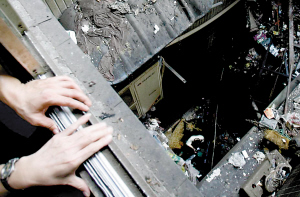 隨后,記者進入金湯大廈三樓,從電梯間窗戶看下去,正對死者墜樓砸穿庫房的屋頂,可以看到此處垃圾較厚,全堆在屋頂上,中間被砸出一個大洞,垃圾的酸臭味很刺鼻。三樓外墻上一根鐵皮煙道被砸壞。