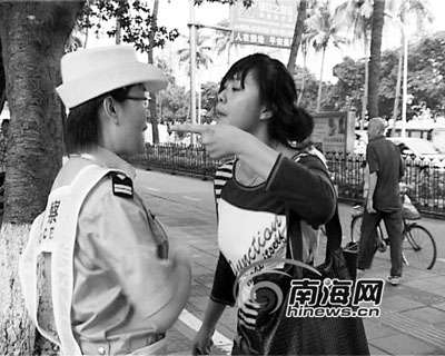 當(dāng)天下午4點(diǎn)45分,22歲女大學(xué)生小蕊走出銀龍影城橫穿6個(gè)車道后,在首力大廈被現(xiàn)場(chǎng)執(zhí)勤的?诮痪瘮r下。當(dāng)交警告知她,翻越護(hù)欄橫穿馬路屬于交通違法行為需接受處罰時(shí),小蕊聲稱自己是第一次,身上也沒(méi)帶錢(qián),隨后便開(kāi)始“發(fā)飆”了。“你她媽的xx,我x你媽!边@名女大學(xué)生開(kāi)始對(duì)交警進(jìn)行辱罵。海口市交警支隊(duì)一名負(fù)責(zé)攝像的工作人員對(duì)這一過(guò)程進(jìn)行錄像時(shí),女子一把抓過(guò)攝像機(jī)準(zhǔn)備砸在地上時(shí),被交警及時(shí)制止,“你要是砸了錯(cuò)就更大了”。