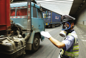 圖為昨天中午,寶山交警支隊民警何海清在外環(huán)隧道內(nèi)頭戴防毒面具值勤,外環(huán)隧道內(nèi)的汽車尾氣加上高溫天的熱度,能讓人窒息