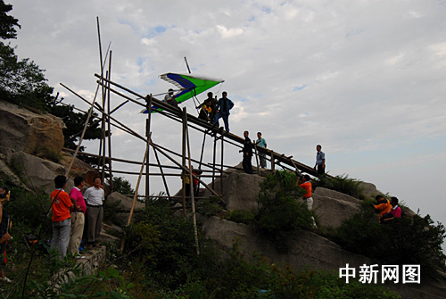 西岳華山,在全球華人的心中有著特殊的地位。金庸大師2003年10月登頂華山論劍,更使華山聲名遠(yuǎn)播。海拔2082米的華山西峰為華山五大主峰之一,一塊完整巨石,渾然天成,絕崖千丈,似刀削鋸截,其陡峭巍峨、陽剛挺拔之勢(shì)是華山山形之代表。一般從事滑翔運(yùn)動(dòng)的愛好者自此飛躍而下并滑翔直線行程6公里。