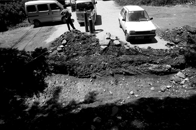昨天下午,復(fù)地灣流匯別墅區(qū)門(mén)前,6米寬的柏油路被橫挖開(kāi)一道近1米深的溝,10多輛車(chē)停在溝邊。住在別墅區(qū)一期的一位業(yè)主稱(chēng),此路于18日下午被挖斷,業(yè)主們只能將車(chē)停在溝邊后步行回家,正在裝修的業(yè)主則因道路不通而不得已停工,“也不知到底因?yàn)槭裁,但太霸道了”?